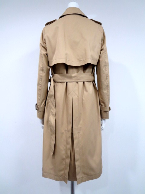 コットン、ブラウン釦、ウエスト・袖口共布ベルト付、長袖ロングトレンチコート